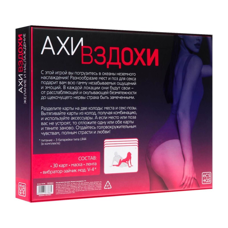 «Ахи-вздохи» — это серия эротических игр для двоих, которая включает невероятное множество пикантных заданий-фантов для него и для неё. Здесь найдутся игры в формате вопрос-ответ, ролевые развлечения и необычные позы для секса. Игры серии «Ахи-вздохи» подойдут для тех, кто только начал романтические отношения и хочет узнать друг друга поближе, а также для пар, союз которых длится уже долго.