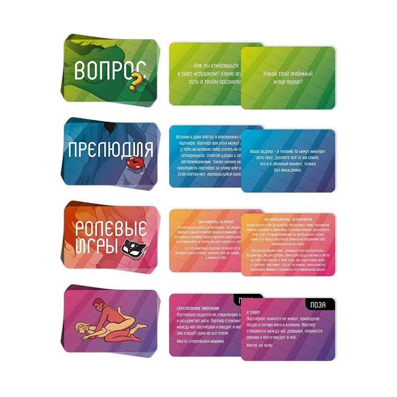 - 60 карт («Ролевые игры», «Прелюдия», «Вопрос», «Позы»)