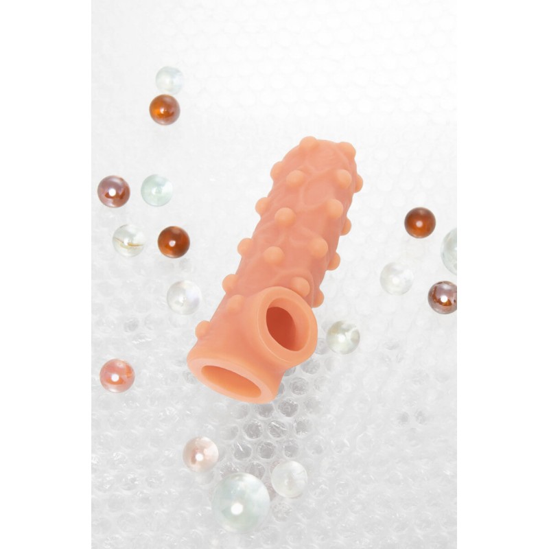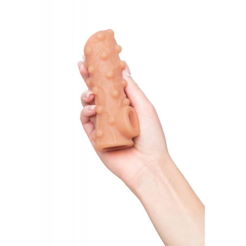 - Насадка имеет форму “рукав”, плотно прилегает к пенису, создавая дополнительную толщину и оставляя головку открытой. Это позволяет сохранить чувствительность головки, задерживая эякуляцию.